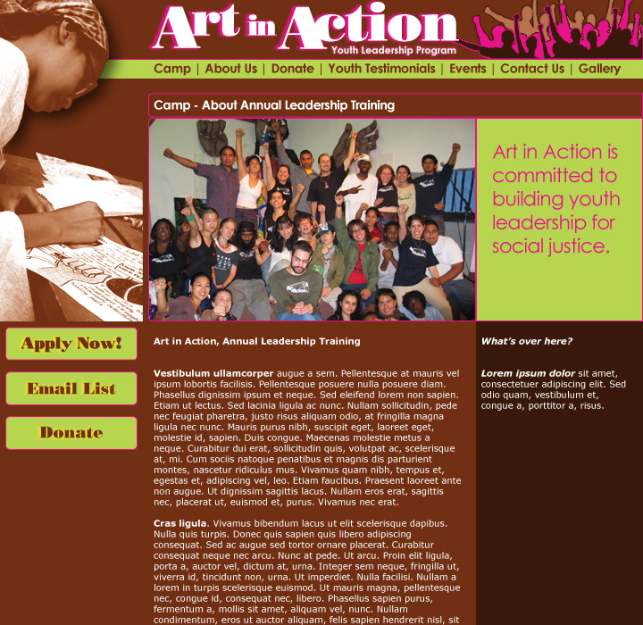Design for youth outreach group. Built for the days of yore, when web pages were typically designed to fit within 800px horizontally.
